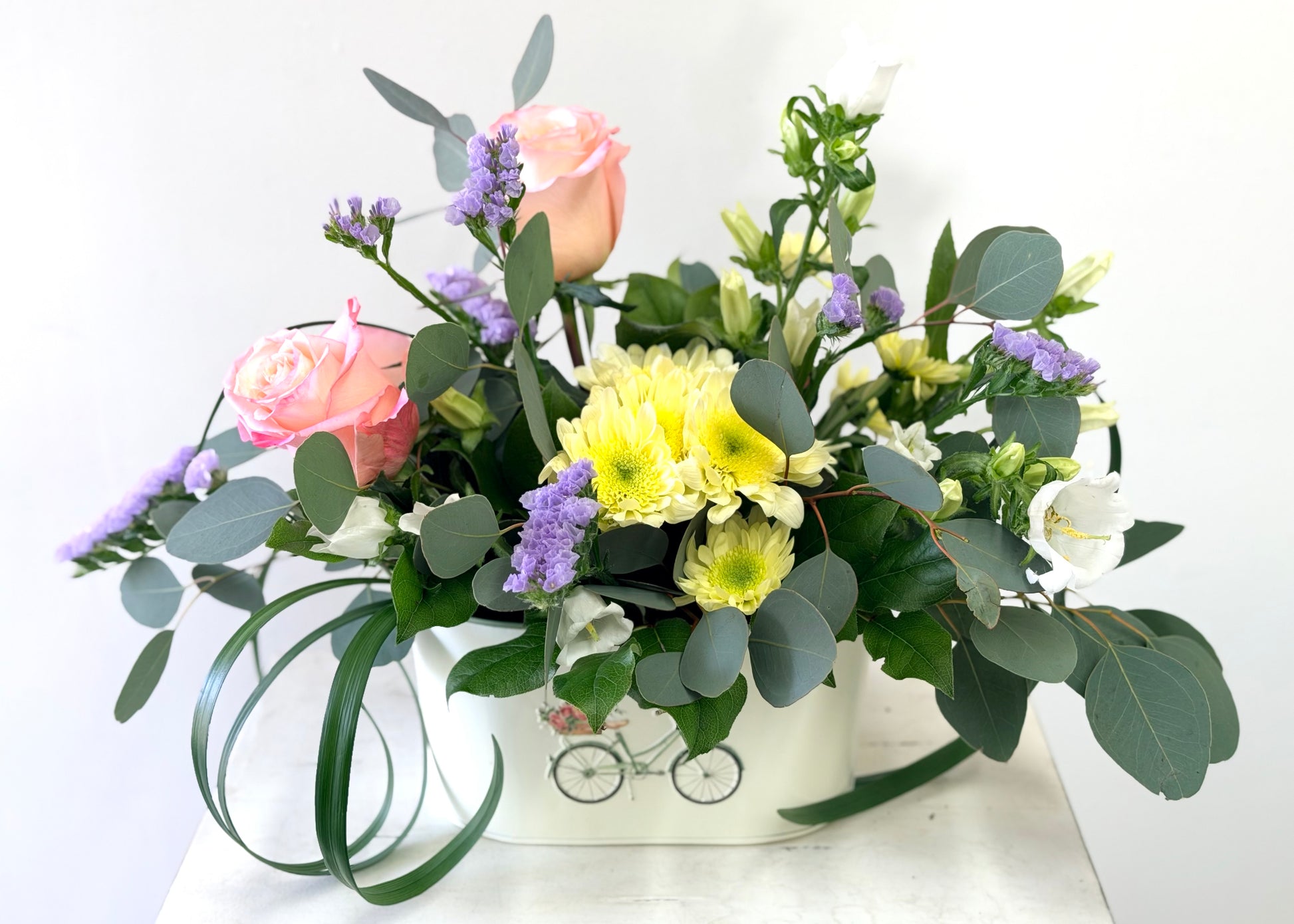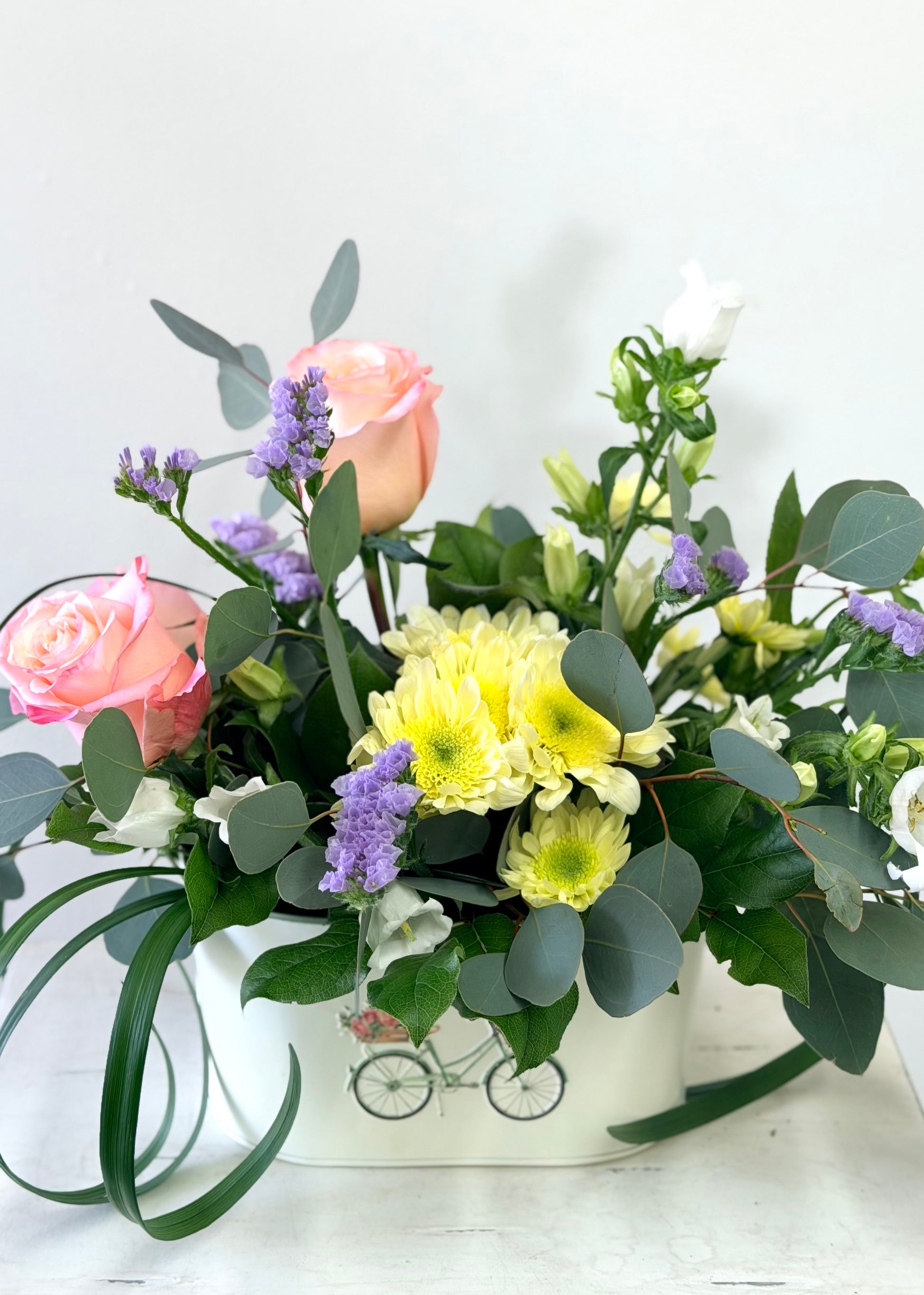 Arrangement floral printanier délicat composé de roses fraîches, de marguerites jaunes, de campanules élégantes et de touches de statice, harmonieusement agencé avec de belles verdures dans un contenant aux teintes douces et printanières.