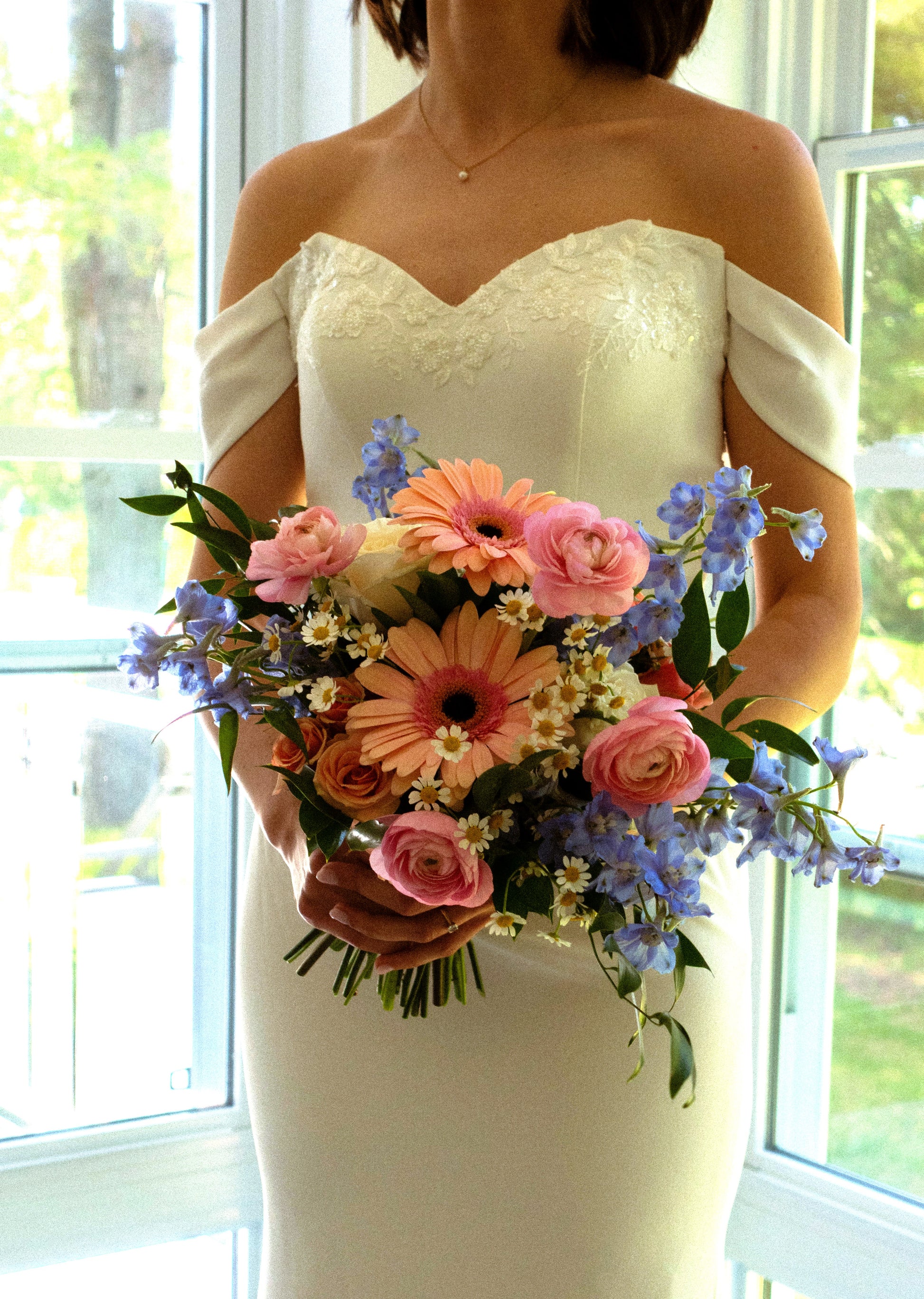 Bouquet de mariée composé de gerberas, de delphiniums, de renoncules, de rosettes, de camomilles ainsi que des verdures.
