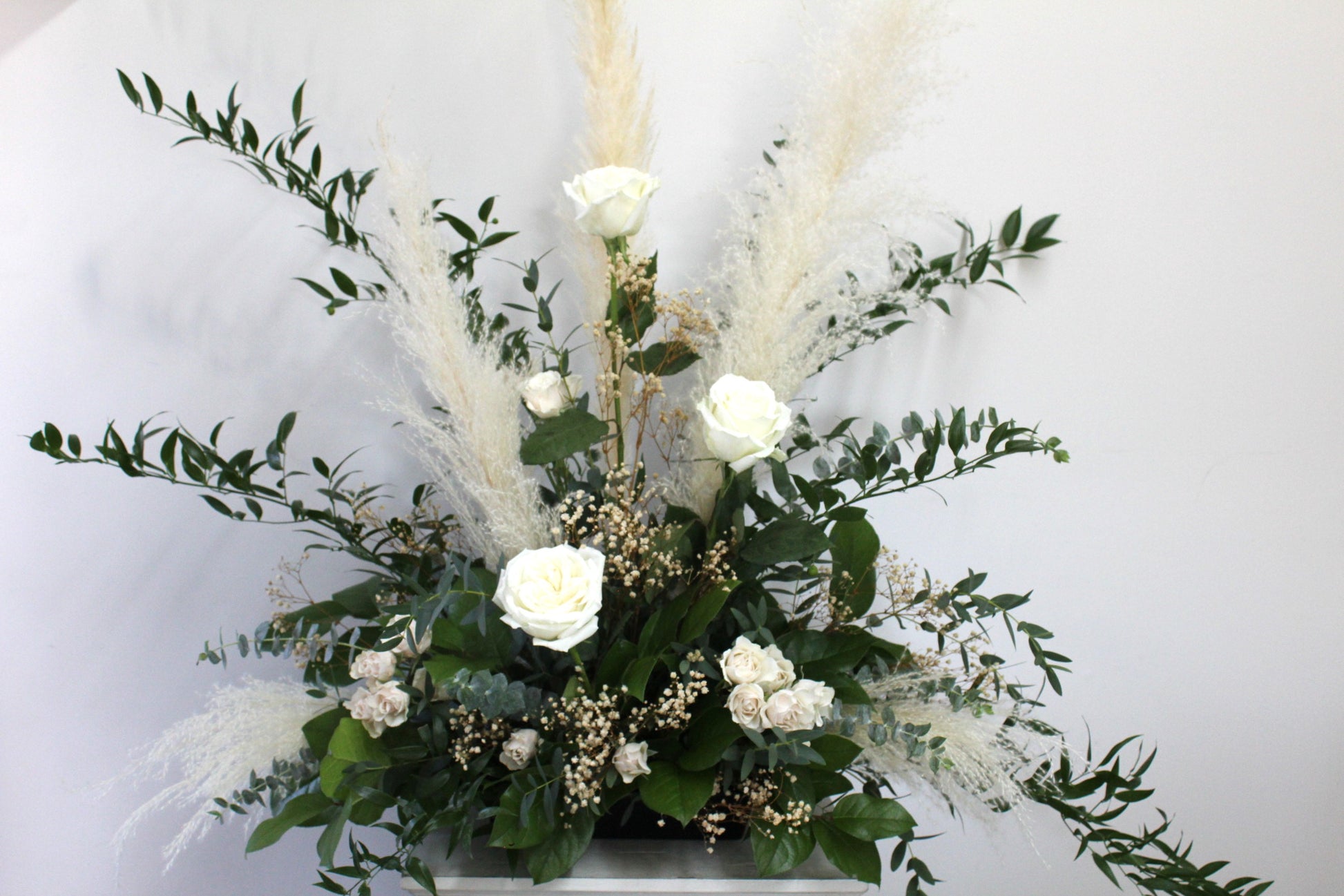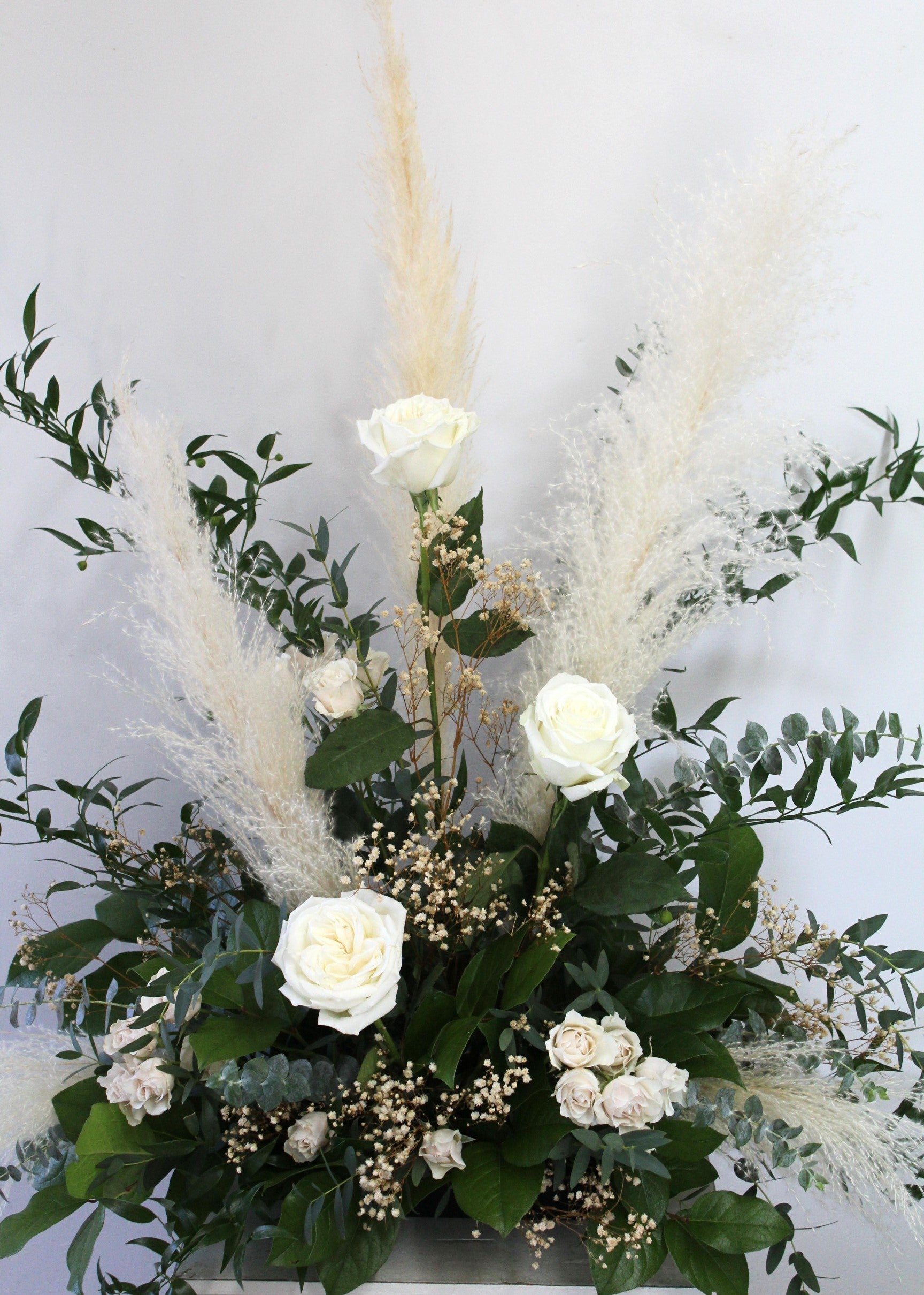 Arrangement fait de roses blanches, de rosette et de graminées. il peut être déposé près d'une arche ou encore pour décorer la salle de votre mariage.