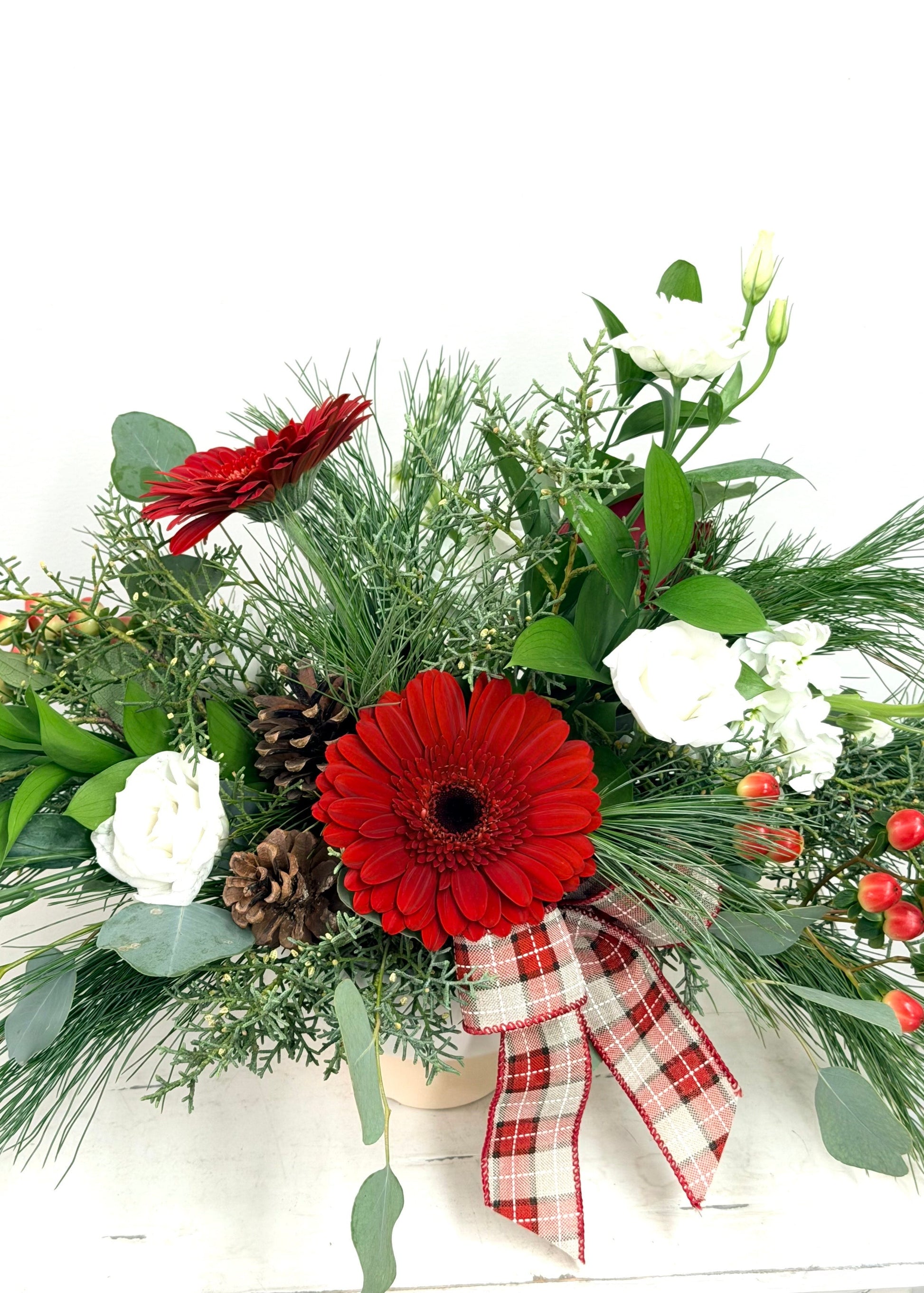Centre de table composé de roses rouges, de gerberas, de baies rouges, de lisianthus, de cocottes et de sapinage dans un vase de céramique.