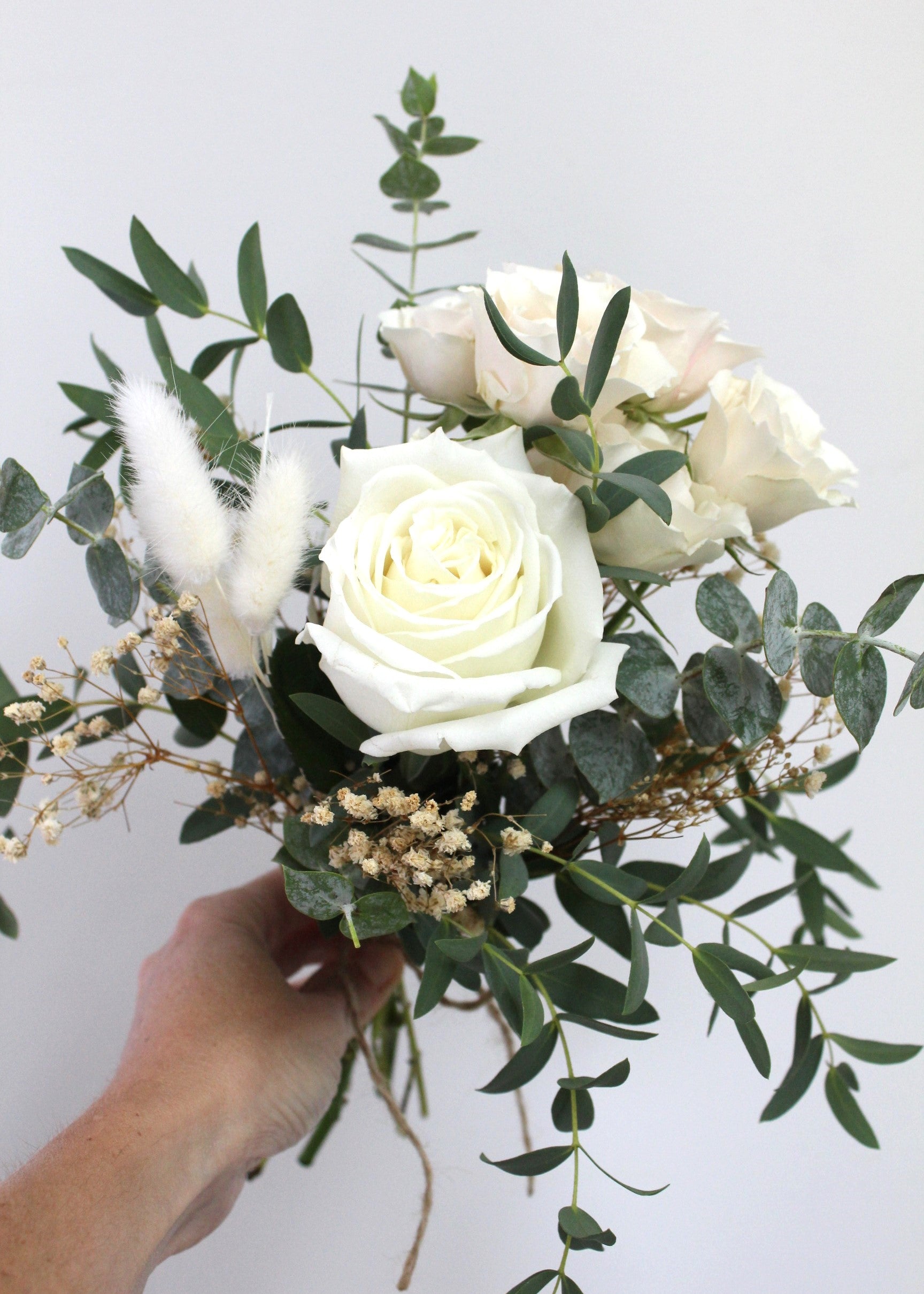Bouquet de fille d'honneur blanc, composé de roses blanche, de rosettes blanches, de fleurs séchées et d'eucalyptus.