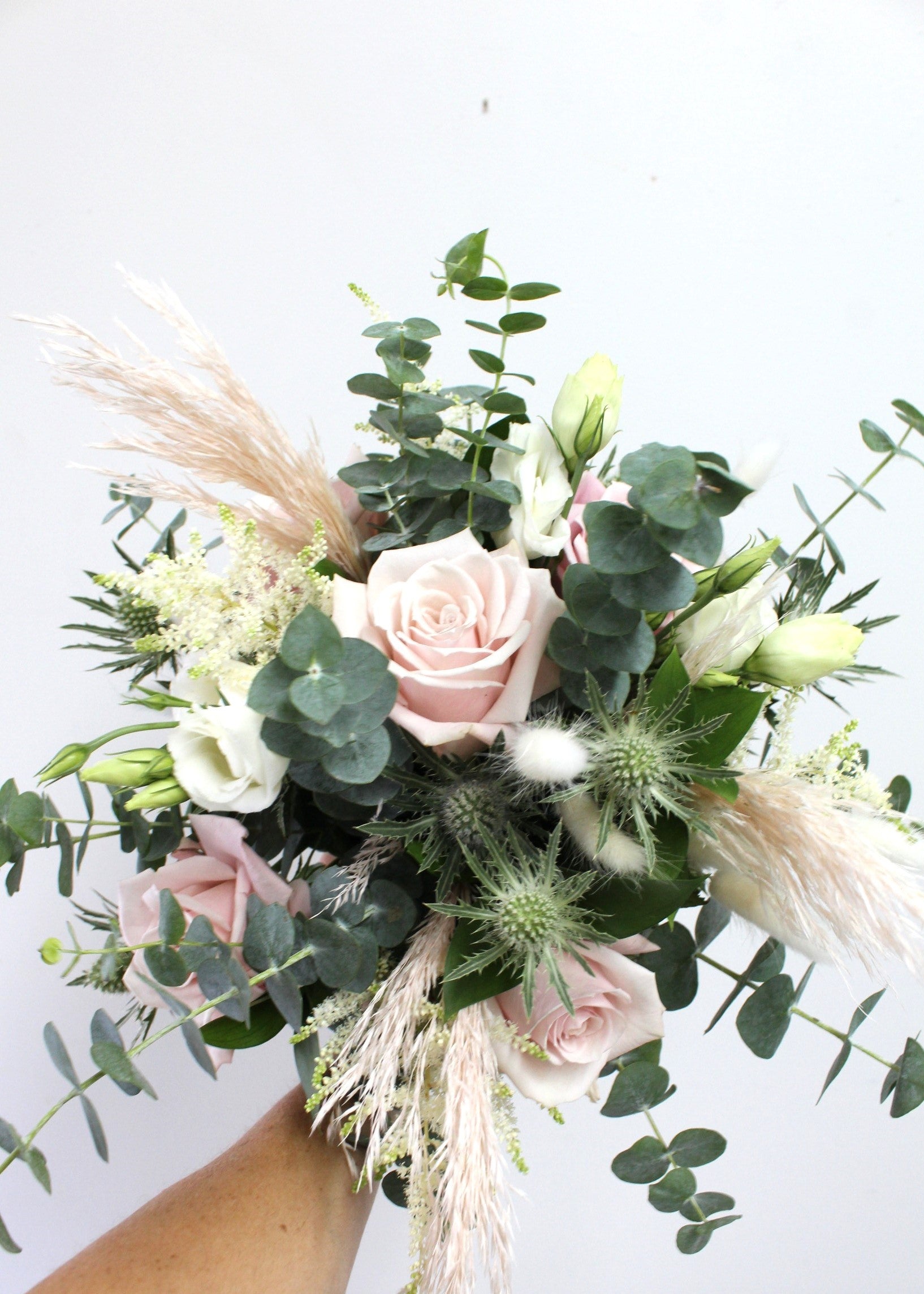 Bouquet de mariée aux couleurs rose et bleu avec des graminées et une petite touche d'eucalyptus.
