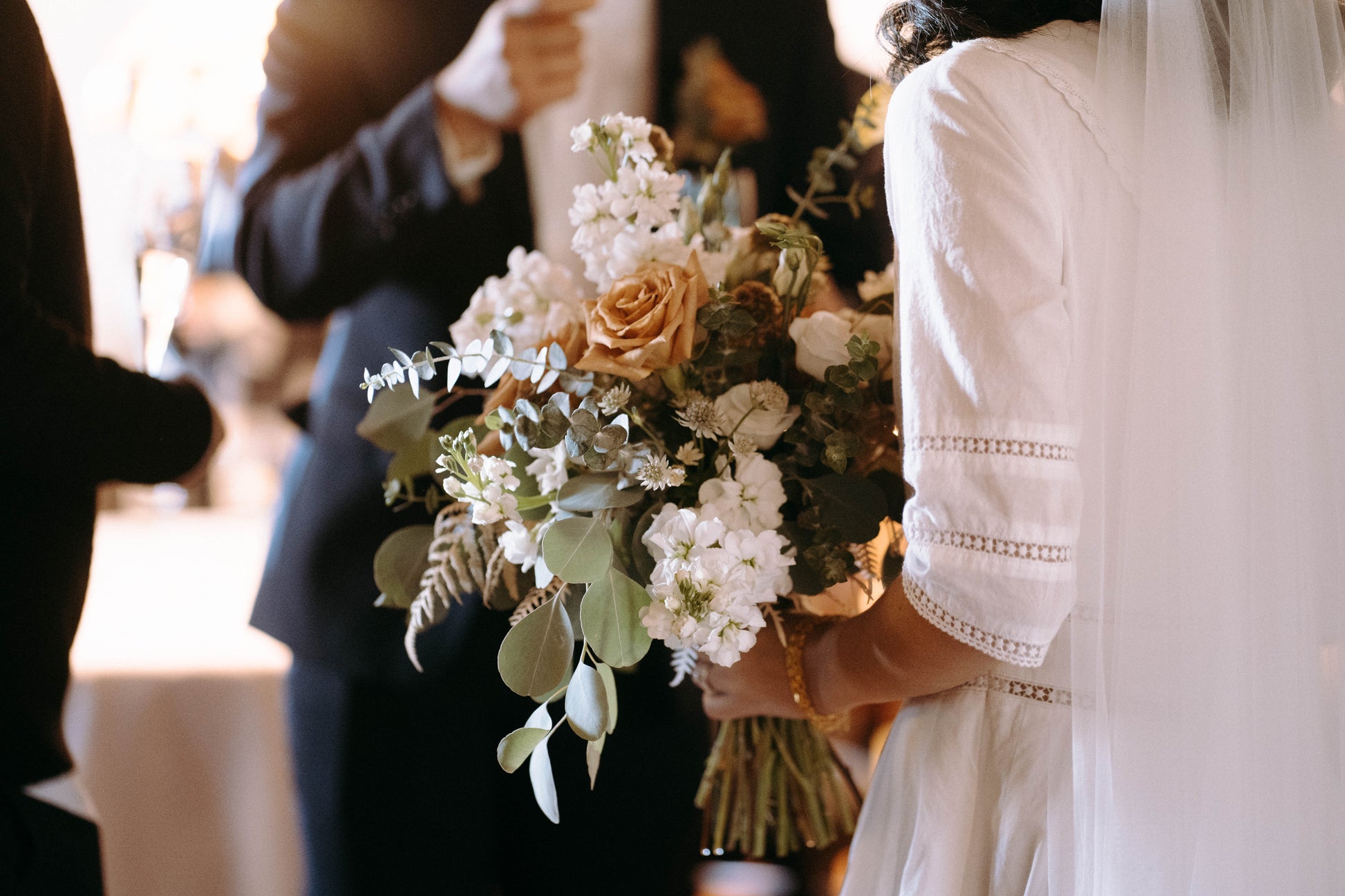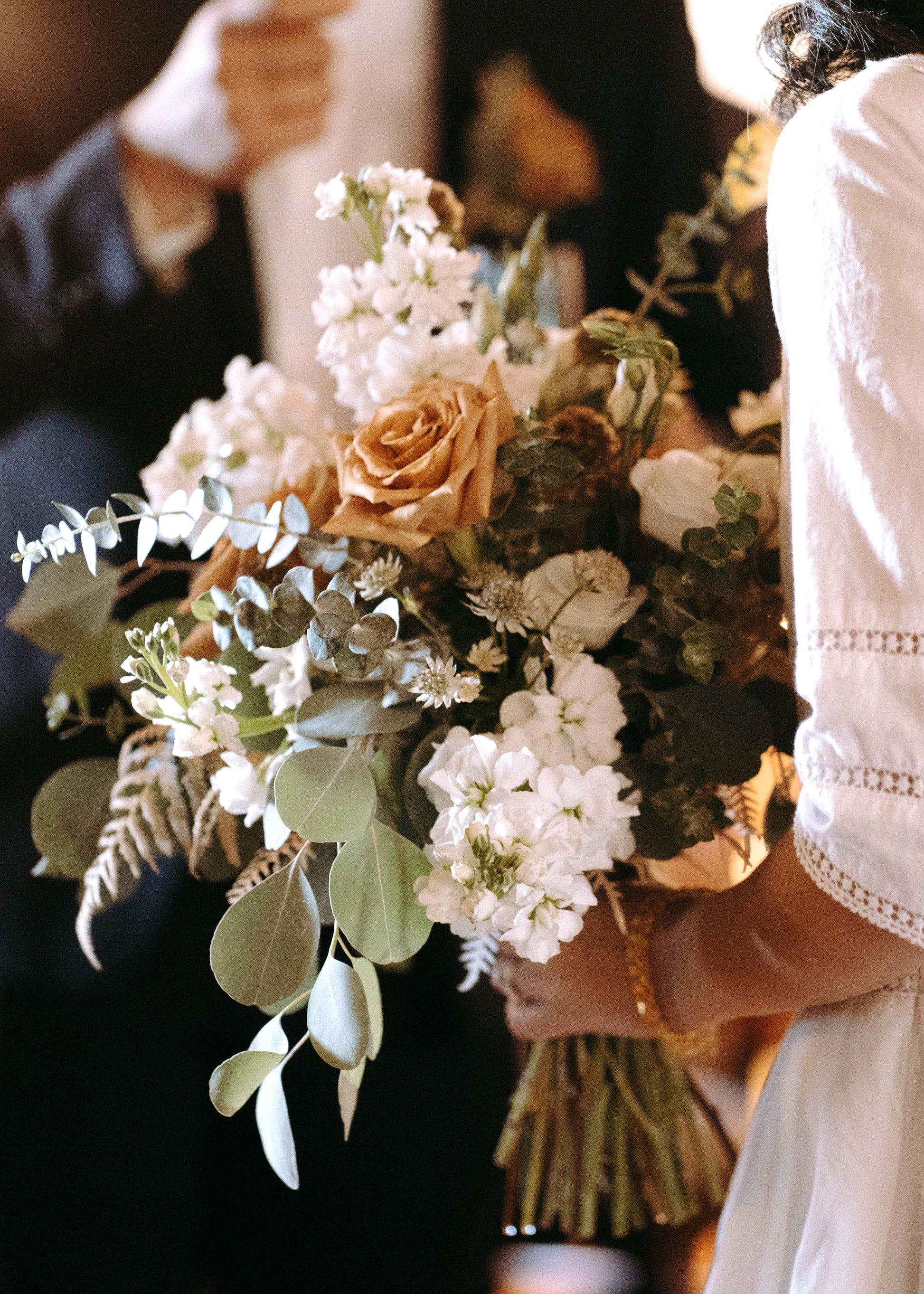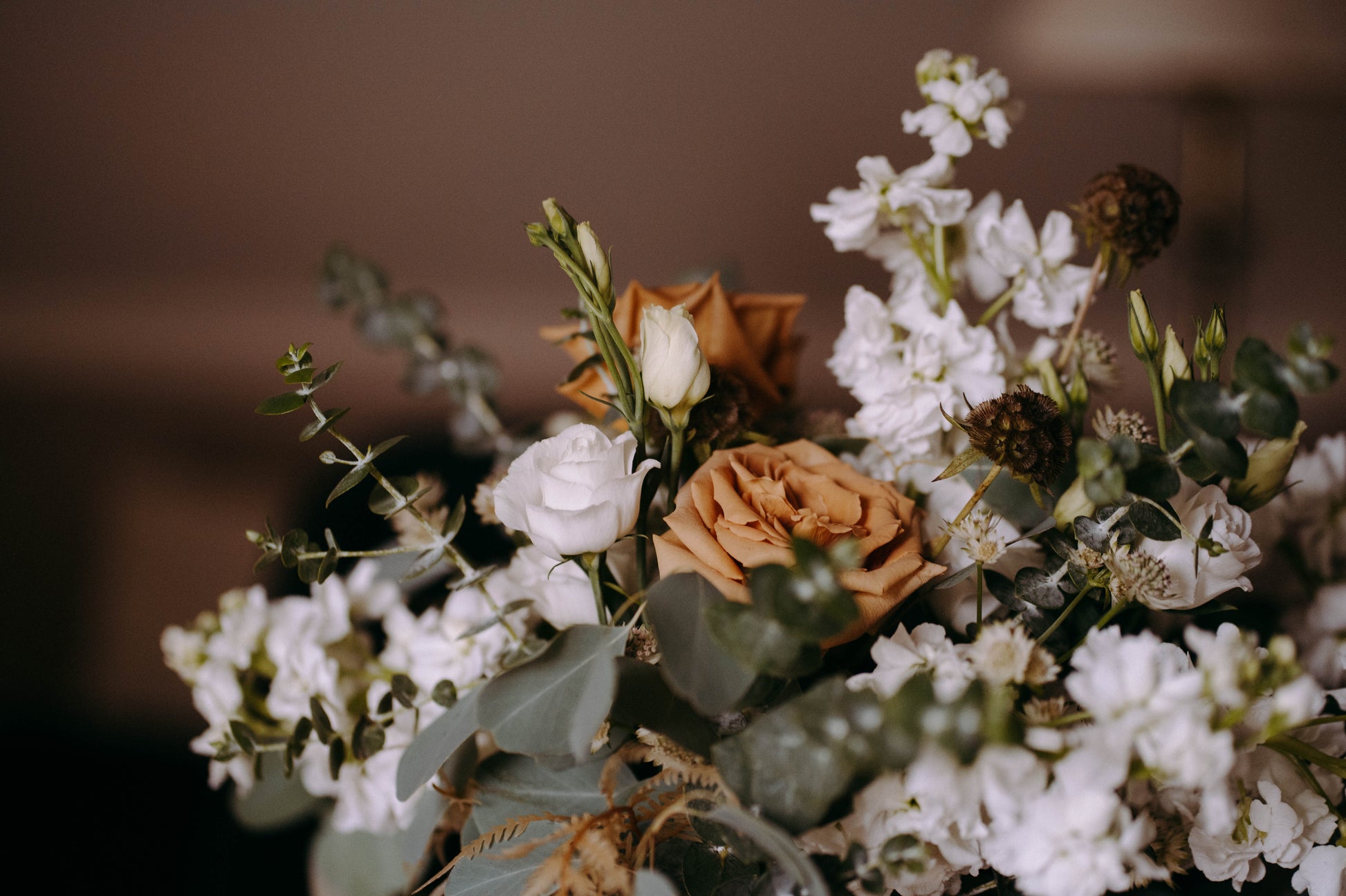 Ce bouquet de mariée évoque la douceur feutrée avec ses teintes terracotta chaudes et terreuses qui nous rappelles l'arrivé de l'automne. Il est composé de roses, de lisianthus, de giroflés, d'astrantias, de scabiosas ainsi qu'un mélange d'eucalyptus et de fougères séchées.
