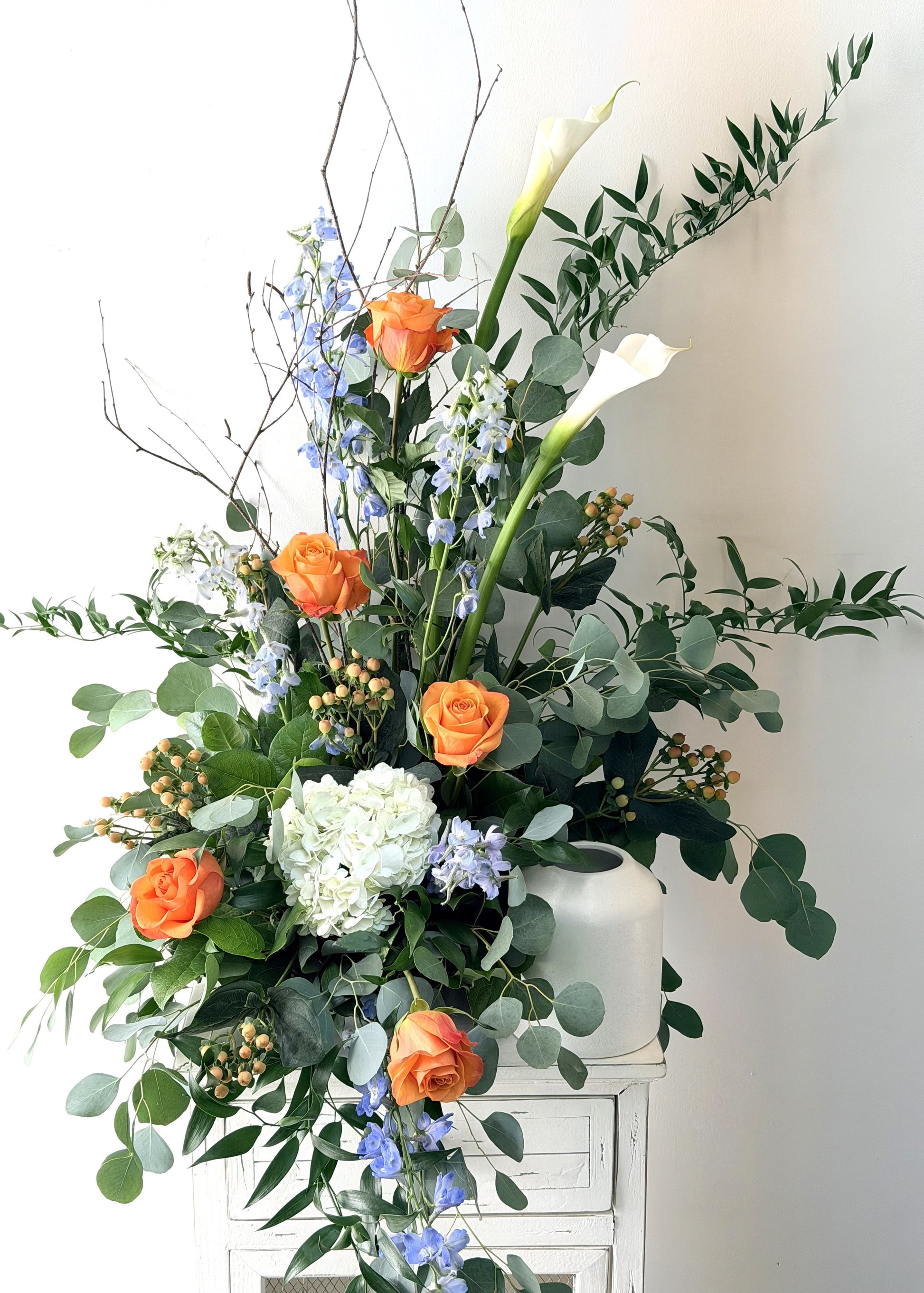 Arrangement pour urne funéraire composé de fleurs bleus, blanches et oranges.